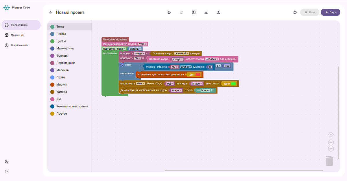 PioneerOS организует работу с дроном через систему функциональных блоков. В интерфейсе выделены инструменты управления полетом, настройки параметров, программирования и работы с данными. Для базовой работы не требуется установка стороннего программного обеспечения, при этом сохраняется возможность использования дополнительных инструментов при необходимости.