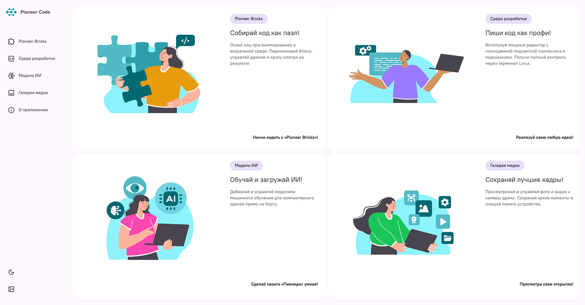 В операционную систему встроена веб-платформа Pioneer Code (Пионер Код). Доступ к ней осуществляется через браузер после подключения к дрону по беспроводной сети вайфай (Wi-Fi). Платформа включает среду блочного программирования Пионер Брикс (Pioneer Bricks), текстовую среду разработки Код ОСС (Code OSS), регистр моделей искусственного интеллекта и галерею фото- и видеоданных. Пользователь может создавать алгоритмы управления, работать с телеметрией и анализировать изображение в рамках учебных задач.